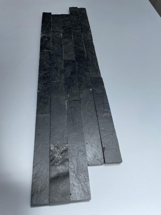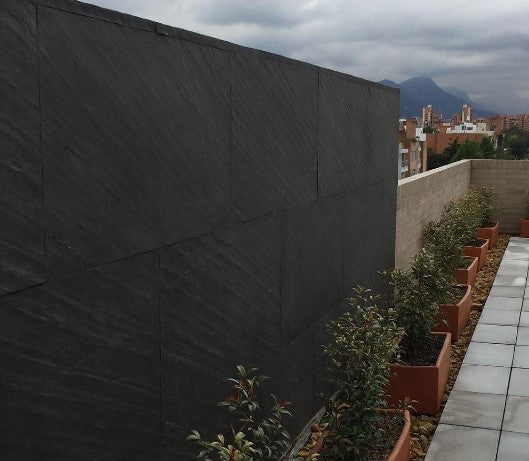 El relieve de la piedra negra crea profundidad y volumen, agregando un atractivo único a la pared y convirtiéndola en un punto focal.