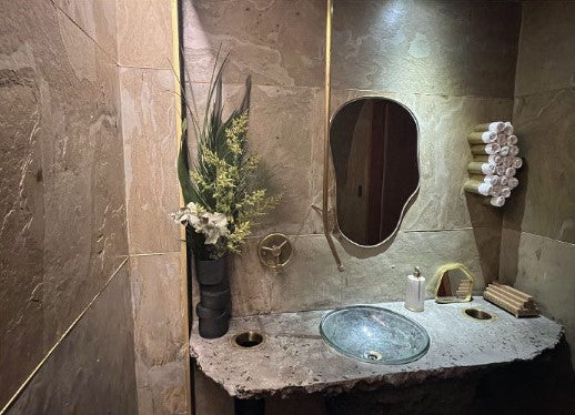 Si nos referimos a una mesada de baño, solamente tendremos que tener en cuenta el correcto sellado de la misma a la exposición de agua para evitar cualquier filtración de agua entre uniones en caso de no rellenar las juntas. Esto se soluciona de modo muy sencillo, utilizando el recubrimiento de protección de base de agua para piedras rústicas sobre el revestimiento para generar una película de protección.